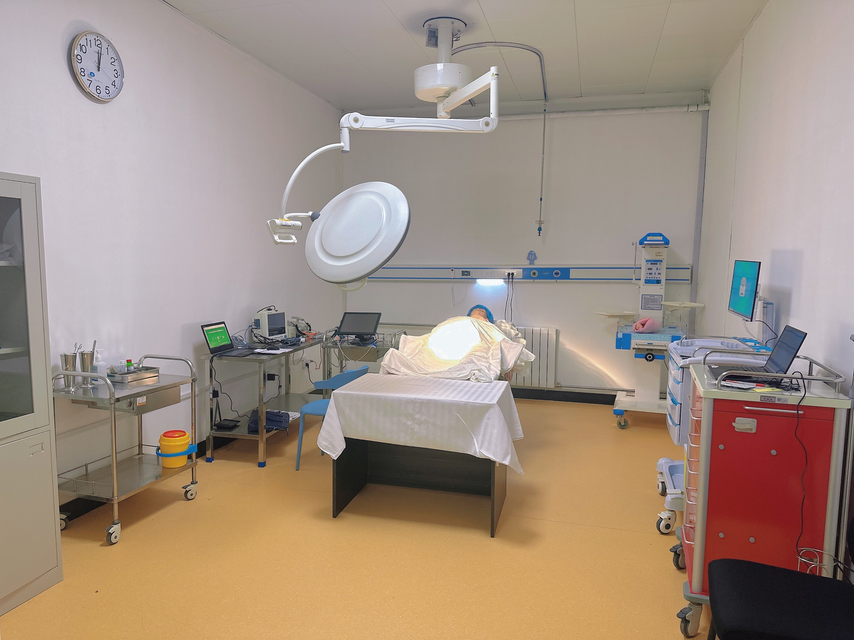 模拟无菌产房,配有高级自动分娩模型、母婴监护仪等设备,可模拟真实状态下胎儿分娩的产前、产中、产后过程,实施各种分娩检查及紧急情况下的救治。该训练室可进行腹部检查、胎心监护、产程观察、正常分娩接产、产科常用技术、会阴切开与缝合术等助产技能的实训教学。