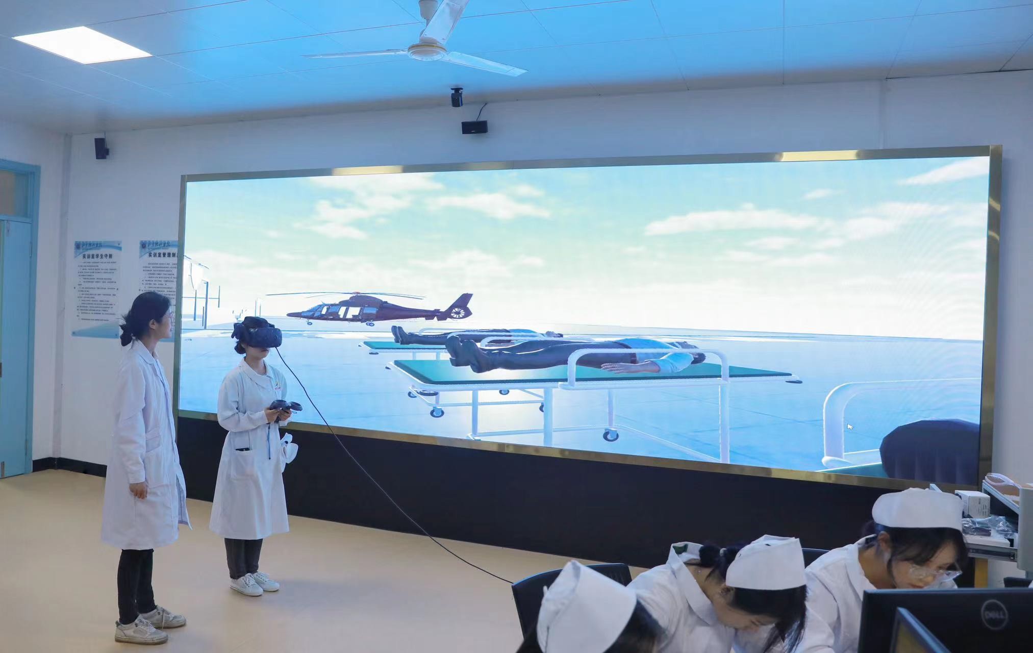 虚拟仿真实训室利用 3D 仿真技术及 VR技术,构建了高度仿真的抢救教学真实环境,可利用案例式、交互式、游戏式的教学方法,构建虚实结合的一体化创新教学方案,培养学生的临床思维和自主学习能力。高度仿真的抢救环境,比如心肺复苏、脑卒中、胸腔闭式引流、气管插管等软件内容都可观看教学。